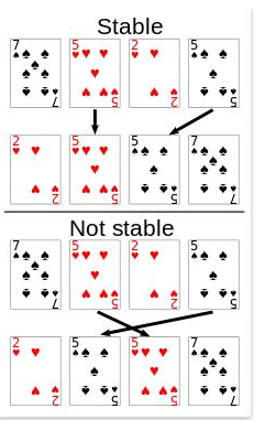 반면 삽입정렬의 경우 그 요소를 찾아서 뒤집지않고 한칸씩 밀며 삽입하기 때문에 순서가 바뀌지 않는다. 또한, 버블정렬은 비교할때에 바로 뒤의 원소만 비교하기 때문에 또 순서가 바뀌지 않는다.