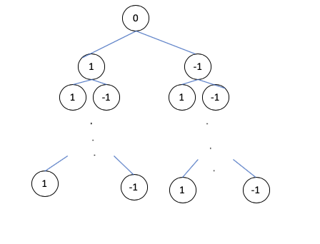 첫 합계를 0으로 시작하여 각 숫자별로 +와 -로 나눠 트리를 그려보면 이진트리가 나타난다.